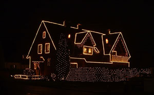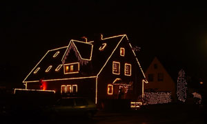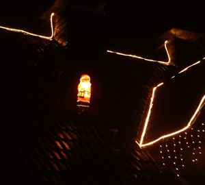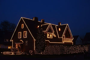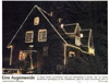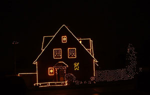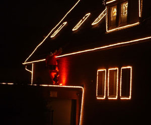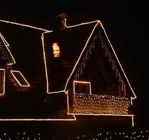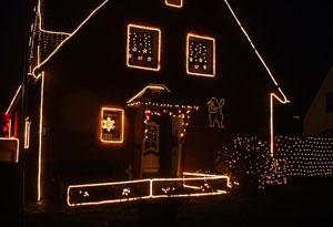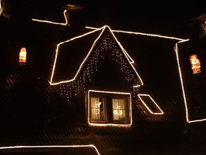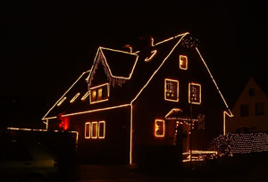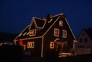 Mit einer rauschenden Einschaltparty wurde unser Haus am 27.11.2004 eingeschaltet. Wir haben die Beleuchtung reichlich erweitert. Nun sind nicht nur die Dachfenster, sondern auch alle anderen Fenster beleuchtet. Neu sind auch die Eislichtvorhänge an den Dachgauben, die Beleuchtung an der Garage sowie der Lichtschlauch an dem Zaun vor der Haustür. Erweitert haben wir auch die Heckenbeleuchtung. Um die Haustür ist eine beleuchtete Tannengirlande und an der Fahnenstange ein leuchtender Adventskranz. Insgesamt haben wir jetzt ca. 310 Meter Lichtschlauch am Haus. Weitere Daten: ca. 100 m Verlängerungskabel, 24 m Eislichtvorhänge, 13 Lichternetze, 3 Lichterketten mit insgesamt 600 Lämpchen. Außerdem diverse Weihnachtsmänner, mehrere Fensterbilder, Sternenlichtvorhänge, Sternenstäbe sowie 9 Zeitschaltuhren. Da diese